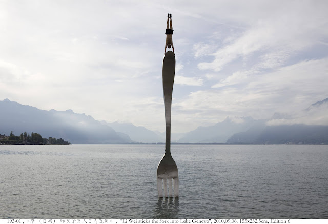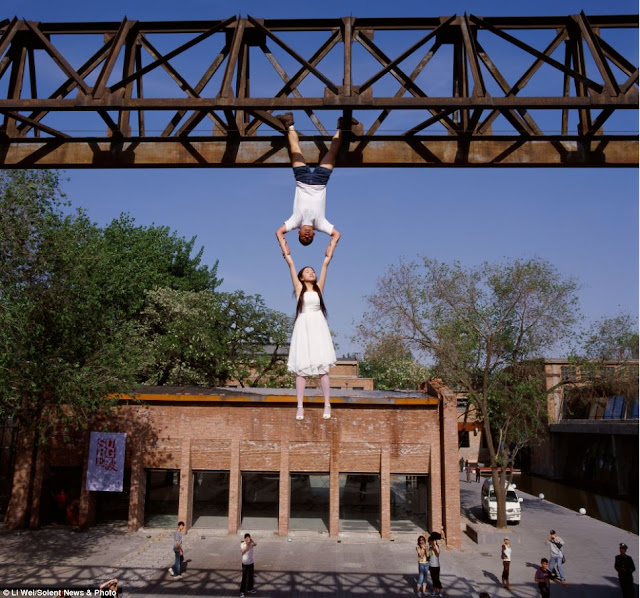 Li Wei (born in 1970, Hubei, China) is a contemporary artist from Beijing, China. His work often depicts him in gravity-defying situations. His work is a mixture of performance art and photography that creates illusions of a sometimes dangerous reality. Li Wei states that these images are not computer montages and works with the help of props such as mirror, metal wires, scaffolding and acrobatics.